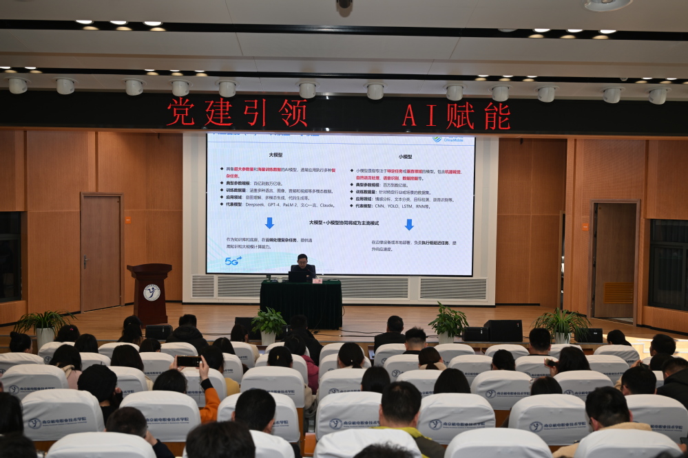 本次讲座有幸邀请到江苏移动人工智能研发中心高级专家、中国移动十百千专家杜曦担任主讲人。杜老师凭借深厚的专业知识和丰富的实践经验,深入浅出地讲解了AI大模型以及Deepseek,从理解到剖析再到赋能,包括如何安全使用大模型,每一处都鞭辟入里,为师生打开了全新的认知大门。杜老师指出,人工智能是引领新一轮科技革命和产业变革的战略性技术,高校作为科技第一生产力、人才第一资源、创新第一动力的重要结合点,要主动拥抱人工智能,积极探索人工智能与教育教学深度融合的新路径。他强调,要以党建引领人工智能赋能教育高质量发展,将人工智能技术应用于教育教学全过程,推动教育理念更新、模式变革、体系重构,为培养更多创新型人才贡献力量。