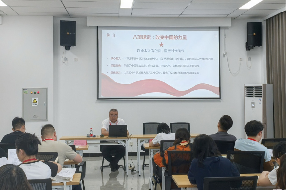 2025年6月26日,在笃行楼401会议室,校党委委员、副校长刁爱军为机械工程系党支部和电子工程系党支部全体党员讲授了一场主题为“八项规定改变中国”的专题党课。党课以“八项规定:改变中国的力量”为核心,深刻阐释了以习近平同志为核心的党中央以中央八项规定为突破口,开启全面从严治党新征程的伟大实践。刁爱军副校长结合详实数据和生动案例,系统解读了八项规定的历史脉络、现实成效与深远影响,并针对师德师风建设提出具体要求,引导全体党员增强党性修养,筑牢作风建设根基。党课内容丰富、深入浅出,为在场40余名党员教师提供了宝贵的精神滋养和实践指导。