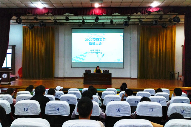 为加强学生对顶岗实习的认识和了解,6月16日下午4点,电子工程系在学院报告厅召开了2020年顶岗实习动员大会。此次会议由电子工程系学工干事朱新文主持,系部党支部书记吴伟萍、辅导员和2018级全体同学共同参加。