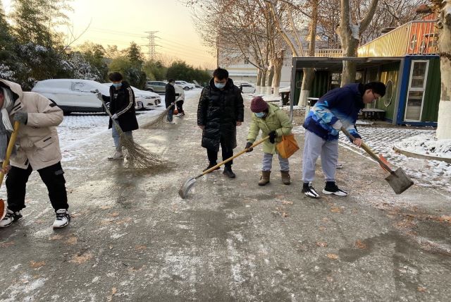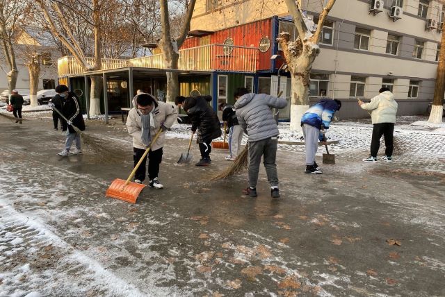凛冽的寒风不能阻挡大家的热情,大家不畏寒冷,积极地投入到活动中来。同学们手拿着铲子与扫帚来到分配的场地,开始清扫工作。地上的冰水与雪花相互融合,在冷风的煽动下,结成顽固阵营,死死抓住地面,考验着人们的耐力与斗志。虽然室外温度很低,但大家劳动的热情和团结的力量让这个冬天变得格外温暖。劳动的过程中充满了欢声笑语,大家乐在其中。洁白的雪花映照着一张张因劳动而红彤彤的脸庞,扫雪队伍成了冬日校园一道靓丽的风景线。