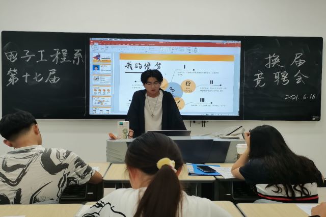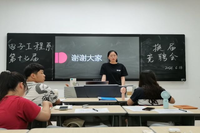 6月21日晚6点,电子工程系团总支第十七届换届竞聘大会在博学楼108举行,参加本次大会的有团总支书记林雪、副书记王诗尚、秘书长张国鑫、各部门的部长和14名参选干事。