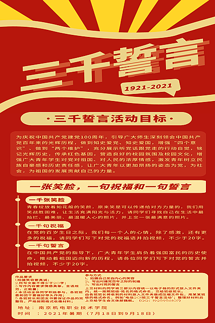 “三千誓言”特色活动,主要面向电子工程系全体学生征集一千张笑脸(自信阳光,非必要照片不遮挡)、一千句祝福(写下对党的祝福语,不少于20字)和一千句誓言(写下对党的誓言,不少于20字)。活动策划方案撰写、海报宣传、方案发布由学生会完成;学生会同时通过线上相关会议方式进行协调推进落实,各班级召开相关班会进行传达本次活动方案和相关要求,活动作品的提交与甄选由各班级和学生会共同进行完成!
