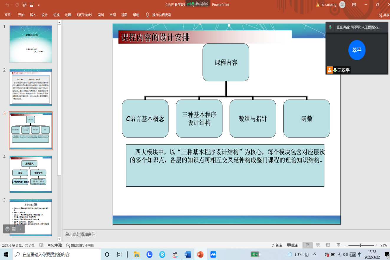 3月22日,基础教研室召开三次教研会议,此次会议主题是无人机专业核心课程教学设计研讨,由基础教研室主任司翠平老师主持,首先司主任简单介绍了此次会议流程,由每个老师介绍自己本学期所教授的专业课程和教学设计,司主任首先介绍自己的专业的课程—《C语言程序设计》,司老师从课程性质,课程内容,上课形式和实验实训项目5个方面阐述C语言这门课程上课计划和教学设计。