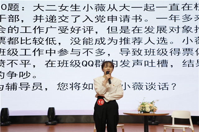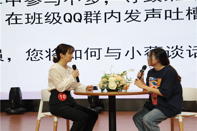 谈心谈话环节,贺竞男老师和吴婧佳老师迅速抓住问题重点,了解学生的困惑并进行正确的引导,设身处地的从学生角度解决问题,使学生在感受到辅导员善意的同时慢慢敞开心扉,畅所欲言。经过激烈的竞争,贺竞男老师和吴婧佳老师分别获得了总决赛的二等奖和三等奖,向大家充分展现了辅导员的个人魅力以及开展学生思想工作的艺术方法。