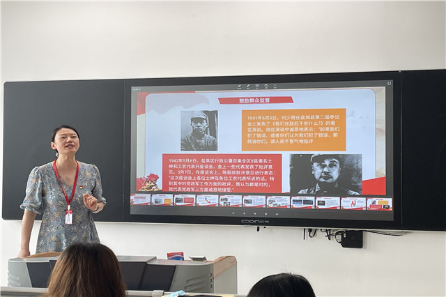 《东征初抵高淳》组诗开启了本次政治学习的序幕,从诗的由来,描绘的场景开始杨劲静老师通过新四军群众路线概述、新四军群众路线的必要性、新四军群众路线的实践三方面给大家展开。