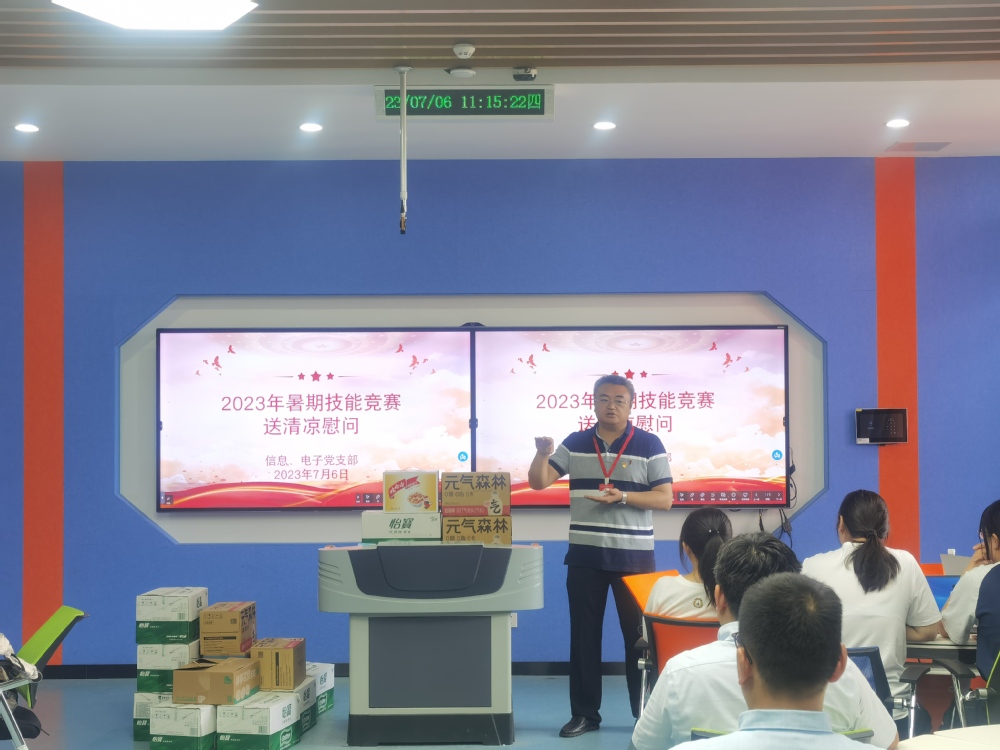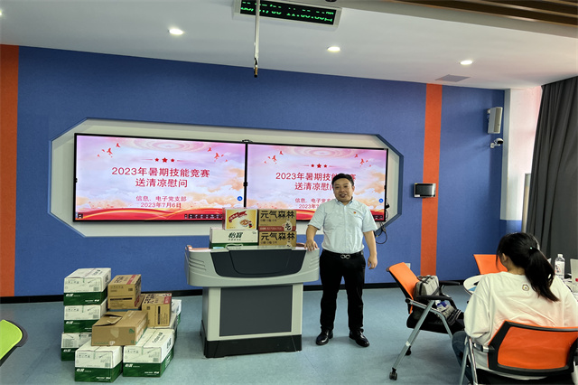 夏至已至,酷暑渐浓。为缓解燥热天气,保障我系暑期技能竞赛队师生完成备赛任务,切实关心关爱师生身心健康与人身安全,将“暖心行动”传递到基层。2023年7月6日电子工程系、信息工程系党支部联合高淳移动党支部,共同为两系暑期技能竞赛团队送清凉慰问。乐投线上平台(集团)官方网站党委委员、副院长刁爱军,中国移动通信集团江苏有限公司高淳分公司党支部书记、经理蔡璨,电子工程系、信息系党支部以及高淳移动党支部委员参加活动。