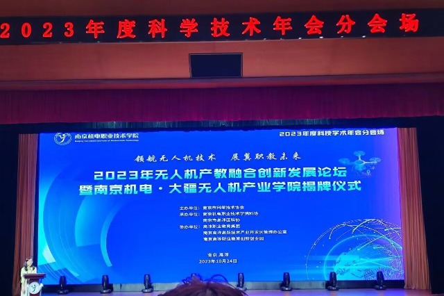 2023年10月24日下午,2023年度科技学术年会分会场——无人机产教融合创新发展论坛暨南京机电•大疆无人机产业学院揭牌仪式在学校青春剧场顺利举行。本次活动由南京市科学技术协会主办,由乐投线上平台(集团)官方网站科协、南京市高淳区科协承办,由高淳职业教育集团、南京高等职业教育创新创业园等共同协办。南京航空航天大学研究生院副院长郑祥明,南京航空航天大学飞行器设计专业工学博士、教授唐正飞,高淳区科学技术协会副主席杨腊斌,南京高等职业教育创新创业园党工委委员、副主任孙爱国,深圳市大疆创新科技有限公司华东区代表滕菲,南京弘谷信息科技有限公司总经理赵华君,南京弘谷信息科技有限公司副总经理顾启凌,学校党委委员、副校长刁爱军,党委委员、纪委书记、工会主席姜振宇等领导出席本次活动。本次活动由学校科研及校企合作处处长李木香主持,电子工程系全体教师及学生代表,高淳职业教育集团理事单位江苏省高淳中等专业学校和高淳第一中学的师生代表参加了本次活动。
