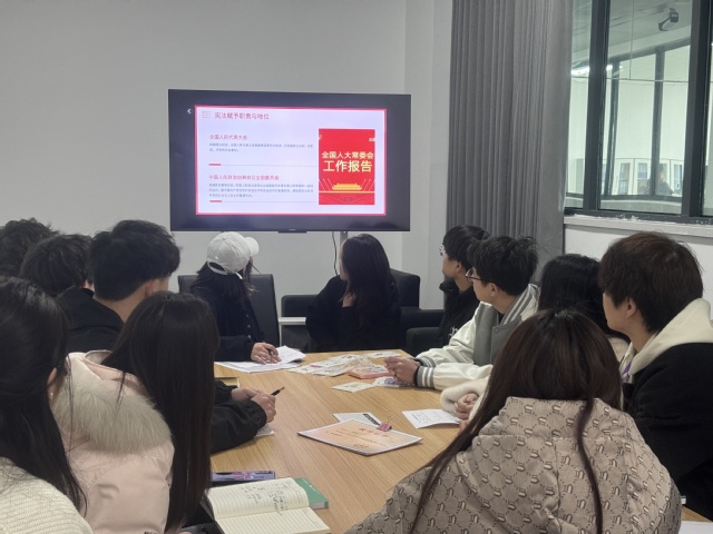 会议开始,朱倩老师介绍了两会的时间和职权,然后分别从性质不同,法律地位不同,职能作用不同,产生方式不同总结了人大会议和政协会议的区别,最后,同学们结合自身实际,交流如何学习两会精神,践行使命担当。