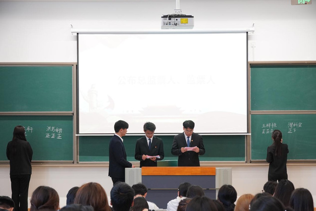 学生会副主席蒋梦涛宣读乐投线上平台(集团)官方网站电子工程系第五次学生代表大会选举办法,本次选举由各代表团在民主推荐基础上产生,采取无记名投票方式,实行差额选举,坚持公平、公正、公开的原则,流程规范。