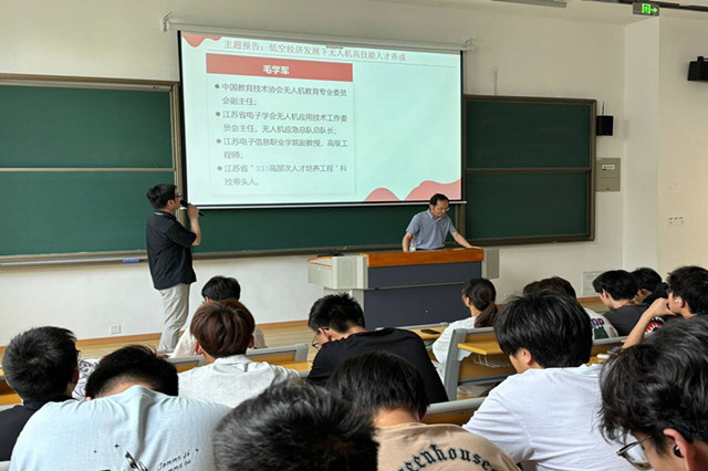 本次活动邀请了江苏省电子学会无人机应用技术工作委员会主任,江苏电子信息职业学院副教授毛学军,为2023级无人机应用技术专业学生开展了《低空经济发展下无人机高技能人才养成》科普讲座,此次活动由无人机应用技术专业教师宋中园主持。