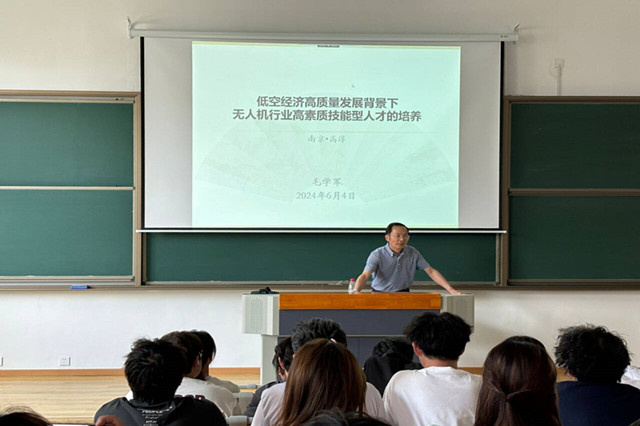 毛学军深耕无人机领域多年,用他丰富的无人机专业知识吸引了同学们的注意力,他从空域、低空经济、全球低空经济概述、我国低空经济市场状况、我国低空经济场景应用、我国重点区域创新实践、无人机行业的人才需求与培养、民用无人驾驶航空器操控员统计共7个方面详尽介绍了我国目前的低空经济现状,并基于此提出高素质无人机技能型人才培养要求,即“校政行企”联动 、 “岗课证赛”融通。