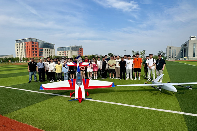 讲座结束后,江苏威思迈智能科技有限公司总经理陈大伟与他的团队带来无人机特技表演—垂直起降无人机航线飞行和固定翼无人机特技飞行,随着无人机时而螺旋上升,时而俯冲下降,精彩绝伦的特技飞行令人目不暇接,同学们纷纷拿出手机拍照记录这酣畅淋漓的视听盛宴。最后,同学们合影留念,顺利结束了今天的科普活动。