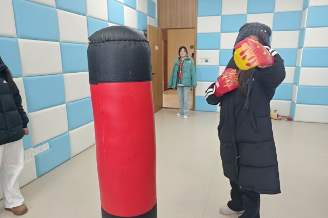 随后,禹花宁带领同学们在学校大学生健康成长中心功能室开展了团辅活动。目前学校大学生健康成长中心主要设有预约接待室、自主调节室、个体咨询室、团体辅导室、音乐放松室、沙盘游戏室等多间不同功能的房间。活动过程中,大学生健康成长中心值班人员向同学们重点介绍了功能室心理自助成长、心理测评、心理咨询、正念冥想、情绪宣泄、VR认知训练、放松训练、团体活动、自主调节等各个方面功能并进行实操演示和体验学习,为师生提供了全方位的心理健康服务。
