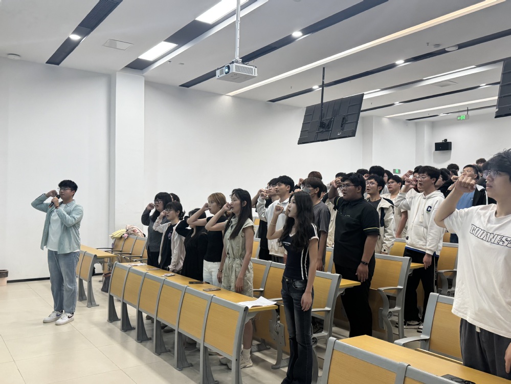 活动在庄严的入团誓词中拉开帷幕。全体团员面向前方,高举右拳,铿锵有力的誓言在教室回荡,展现了青年学子对共青团组织的忠诚与担当。随后,同学们齐唱中国共产主义青年团团歌,激昂的旋律、嘹亮的歌声展现了电子工程系学子昂扬向上的精神风貌。