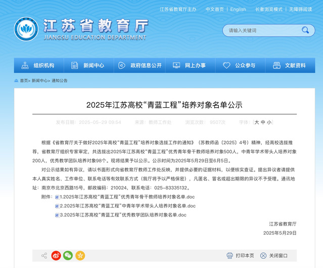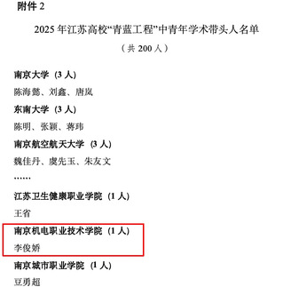近日,根据江苏省教育人才队伍建设年度计划,经各高校推荐,省教育厅组织专家遴选,我校电子工程系李俊娇老师成功入选2025年江苏高校“青蓝工程”中青年学术带头人培养对象,司翠平老师成功入选2025年江苏高校“青蓝工程”优秀青年骨干教师培养对象。