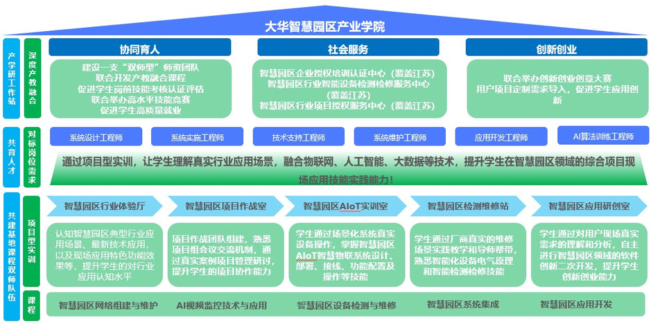 实践基地分为五个空间:含智慧园区行业体验厅、智慧园区项目作战室、智慧园区AIoT实训室、智慧园区检测维修站、智慧园区应用研创室,打造从行业认知—>岗位认知—>人才培养—>社会服务—>行业应用创新的协同育人平台。