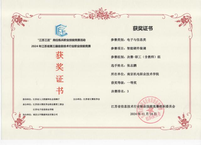 张志鹏,男,硕士,副教授,专业教师,南京市五一创新能手,市级“教学创新团队”负责人;获得省教育厅技能竞赛师生同赛二等奖1次,教师组三等奖1次;获得人社厅技能竞赛省一等奖1次,二等奖2次;获得教学能力大赛省三等奖1次;主持省教育厅教改课题2项,发表论文十余篇,其中北大核心2篇;指导学生参加各类竞赛,获得省二等奖3次,省三等奖5次,指导大学生创新实践项目2项。