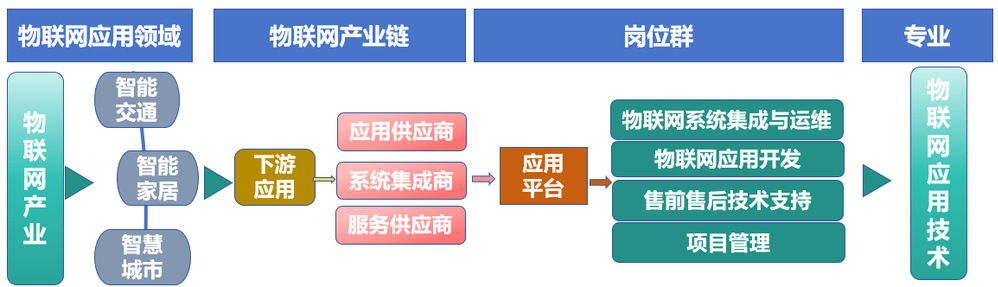 物联网应用技术专业面向江苏省“1650”产业体系的物联网产业集群,聚焦智能交通、智能家居、智慧城市三大智慧物联应用领域,旨在通过将物联网、人工智能、大数据、虚拟现实等新一代信息技术与物联网产业的深度融合,培养服务于地方经济发展的高素质技术技能人才,促进物联网产业的数字化和智能化升级。专业围绕物联网的下游应用产业链,服务于应用供应商、系统集成商和运营与服务商,实现智慧物联系统的设计、集成、管理与运行与维护。