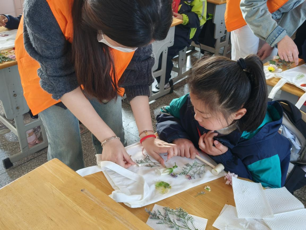 春风拂面,万物复苏。志愿者们为同学们带来了一场充满趣味的植物拓印活动。活动中,志愿者向大家介绍了植物拓印这一独特艺术形式的起源与发展,讲解了其背后蕴含的自然美学理念,引发了同学们的浓厚兴趣。随后,志愿者细致展示了拓印的步骤:从挑选形态各异、纹理清晰的植物叶片和花瓣,到将植物巧妙摆放于帆布包上,再用锤子等工具均匀捶打,让植物的汁液与色彩自然渗透,从而形成独一无二的图案。