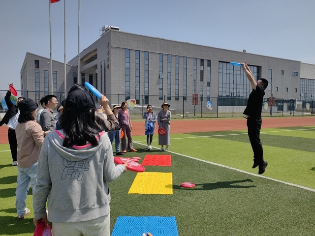 全体参与人员准时到达田径场,由教练员殷翠松给全体老师进行分组,身着不同颜色分队服。他现场教学飞盘正手掷盘和接盘的技巧。在经过5分钟的练习之后,组织进行了飞盘保龄球和趣味飞盘争夺赛。老师们在活动过程中充分沟通,合理分工,进一步提升团队合作能力。