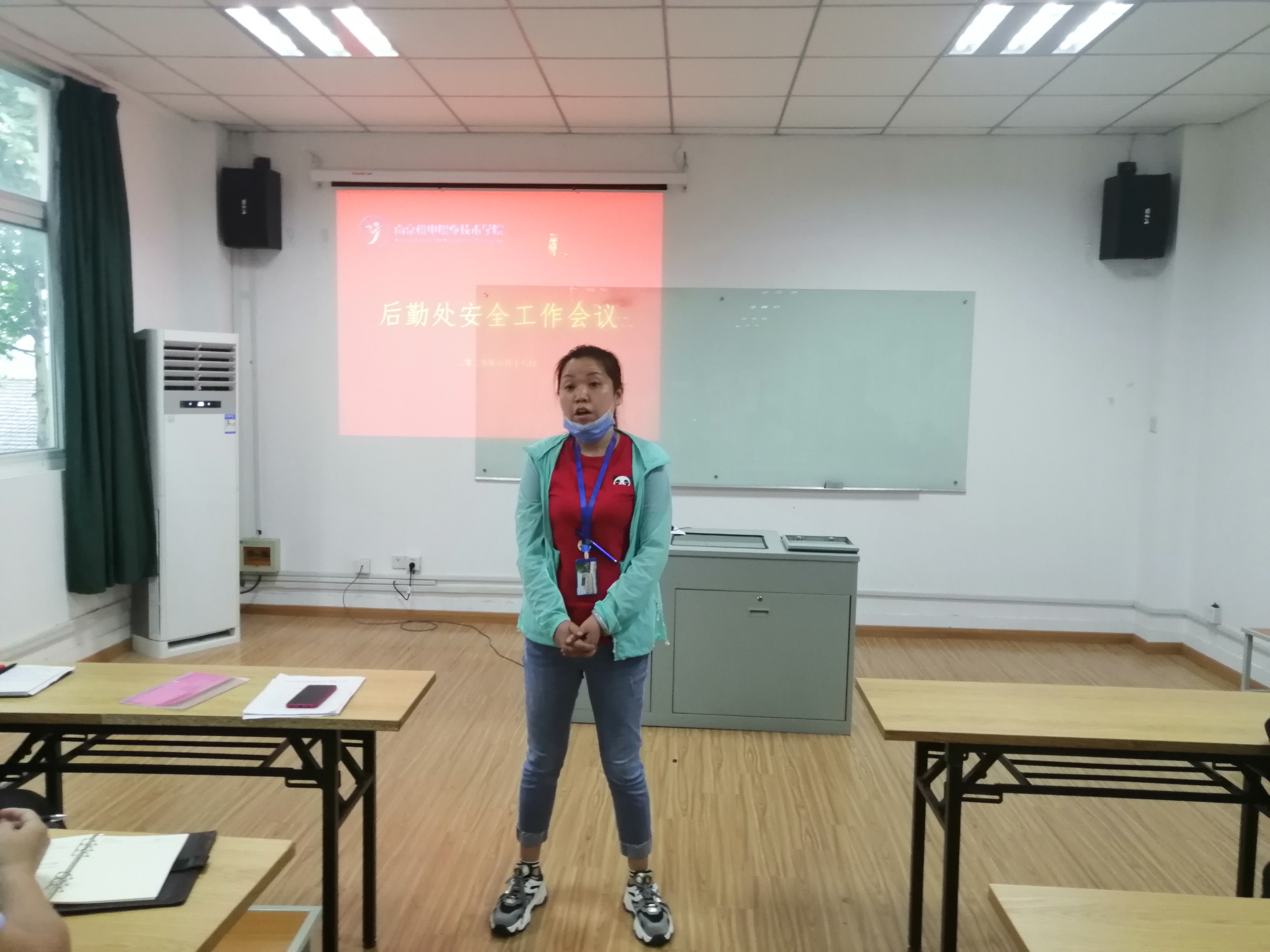 党委副书记、副院长陈赵首先对开学前及开学以来后勤各项保障工作点评,高度肯定了前一阶段大家共同抗疫辛苦的付出和取得的成绩。接着对下一阶段安全工作进行部署,重点强调安全工作关键是树立“安全意识“,要求做到“人人重视安全、人人都是安全员”。提出必须加强从业人员的健康管控、加强后勤管辖范围内的卫生管控、加强食品源头采购的管控、加强食品加工过程管控等具体要求。希望全体后勤人员统一思想、同心协力,做实做细各项工作,坚决打赢疫情防控阻击战,切实保障好在校师生的生命安全。
