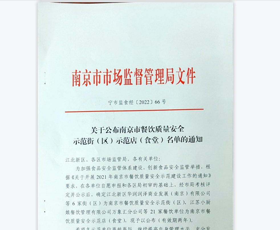 近日,南京市市场监督管理局授予我校“2021年度南京市餐饮质量安全示范食堂”荣誉称号。根据《关于开展2021年南京市餐饮质量安全示范建设工作的通知》精神,经学校申报,高淳区市场监督局初审和推荐,南京市市场监督局复核验收等环节,我校学生食堂获得“2021年度南京市餐饮质量安全示范食堂”荣誉称