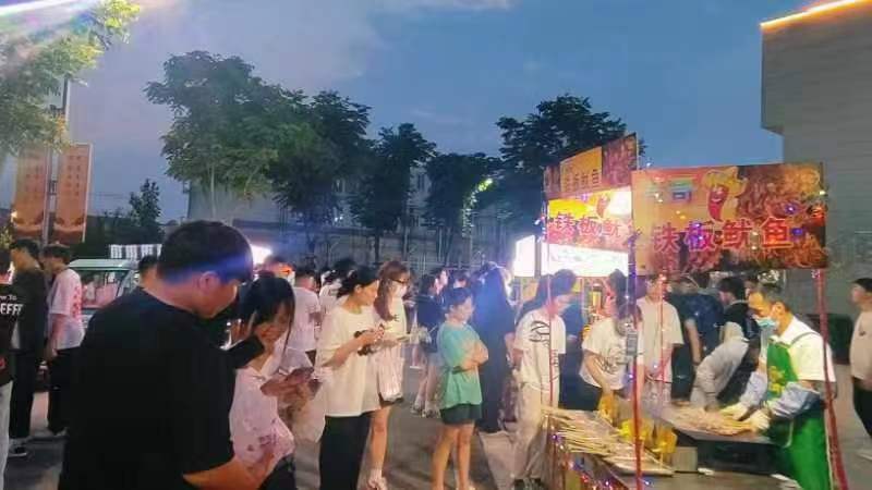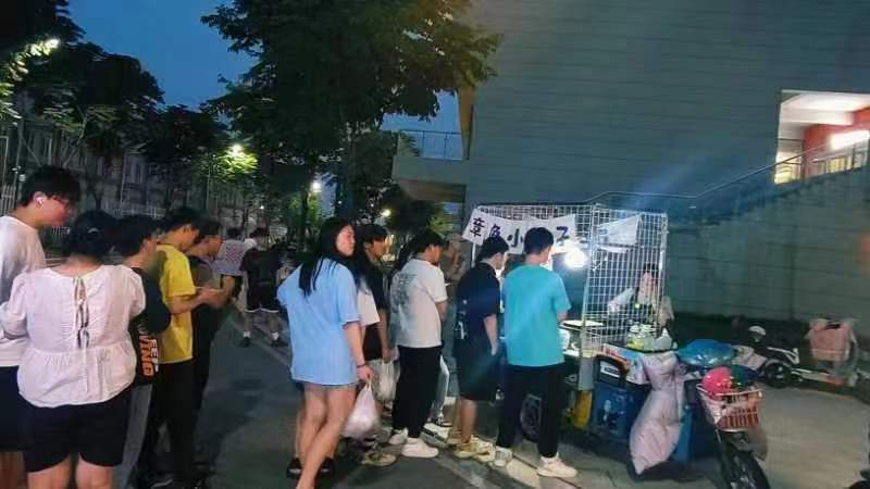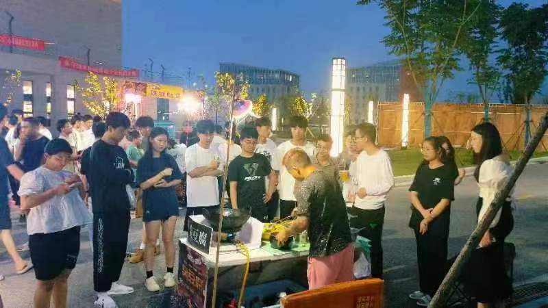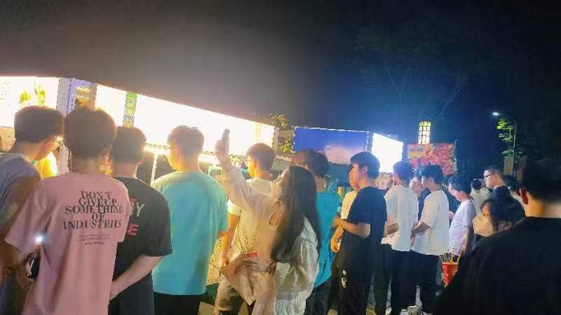 本次夜市有烧烤、铁板、鲜榨果汁、冰粉、章鱼小丸子等8个摊位,美食节上人气最高的美食汇聚于此,每个摊位前都排着长长的队伍,川流不息的人群沉浸在美食的“食海”里,欢快的笑声夹杂着“滋滋”的“烟火气”弥漫在整个校园的夜空。