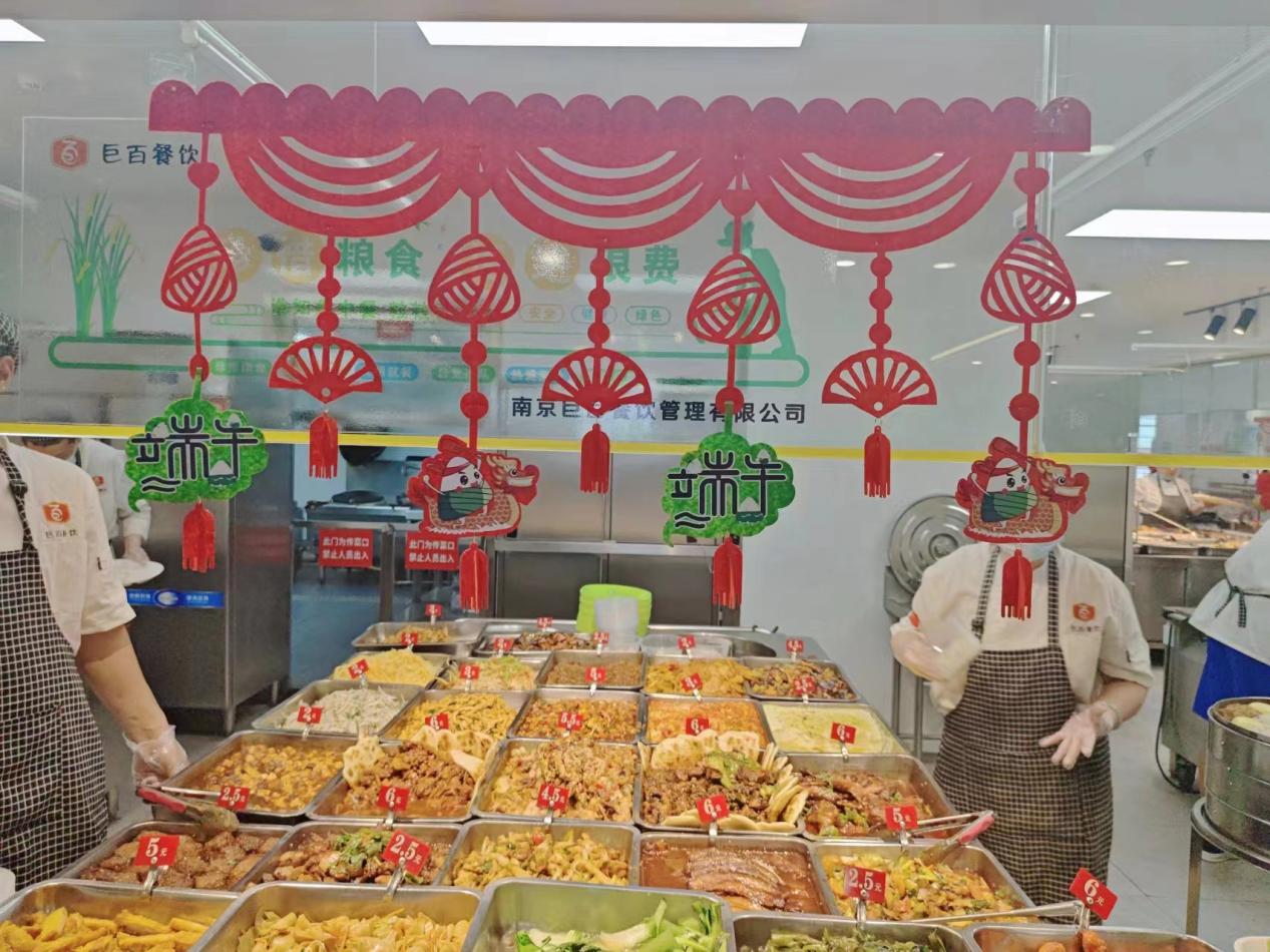 6月21日南京巨百餐饮管理有限公司,用气球、各色剪纸将食堂装扮一新,食堂阿姨和学生一起包粽子和编制手工制品,同时为参加“射五毒’趣味活动的学生分发端午小礼品。