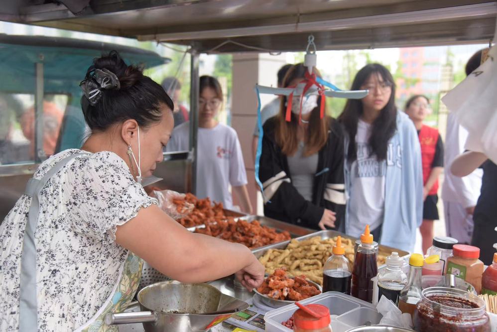 本次美食节设立34个摊位,有近百种菜品呈现,不仅有什锦凉粉、传统海棠糕、湖南臭豆腐、活珠子等传统非遗美食,更有各式烧烤、小龙虾、辣炒花甲、水果捞、炒酸奶、冰激凌、卤味等超高人气小吃。活动现场热闹非凡,连廊外哗哗的雨声压不住美食的香气,浇不灭师生们的热情。