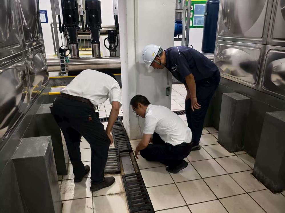 检查组围绕“查隐患、保运行、护安全”的主线,分两组同步展开检查。在配电房,工作人员重点检查了高低压配电柜的运行状态、电缆接头温度、应急照明系统及绝缘工具的有效性,细致排查接地装置情况,并对配电系统的负荷分配与线路标志规范性逐一核实。在水泵房,检查组重点关注水泵机组运行噪声、水压稳定性及管道接口密封性能,详细检查了蓄水池清洁状况、液位控制系统运行情况及应急供水预案的落实情况,全力保障供水系统无泄漏、无异常。