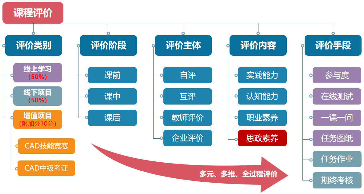 构建“多维、全程”的课程考核评价机制,全面、客观地评价学生的实践能力、认知能力、职业素养与思政素养的养成情况。借助学习通平台,全方位采集教学信息,动态监控学生学习过程。过程性评价从学生课堂表现、参与项目的态度、图纸完成质量等方面进行综合评价;结果性评价通过绘图技能测评成绩,考核学生对知识的综合运用能力。此外,将学生参加CAD技能竞赛、CAD考证等纳入增值评价内容,鼓励学生学以致用,不断提升综合素质。