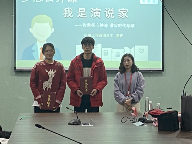 机械工程系团总支于2021年12月14日在学院育德楼203举办梦想公开课暨“中国梦属于青年一代——‘我是演说家’”复赛,本次比赛由办公室秘书长陈童主持,机械工程系党支部副书记李杰、团总支书记沈婷婷、学工干事顾航担任评委。