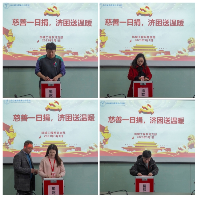 为积极响应南京市政府提出的“慈善一日捐,济困送温暖”号召,2023年3月1日中午12:30,机械工程系党支部全体教职工积极捐款,支持扶贫济困。活动中,教职工慷慨解囊,用实际行动诠释了扶贫济困、乐善好施的传统美德,为扶贫事业贡献自己的一片爱心。