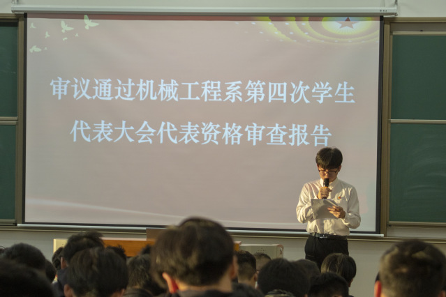 机械工程系团总支代表王可仪宣读学生代表大会贺词,机械工程系学生会主席韩田源宣读机械工程系第四次学生代表大会代表资格审查报告,机械工程系学生会副主席汤茂田宣读《乐投线上平台(集团)官方网站机械工程系第四次学生代表大会选举办法》,各项报告在热烈的掌声中一致通过。