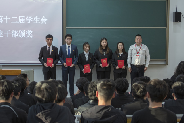 机械工程系学生会主席韩田源公布我系第十四届学生会优秀学生干部名单,毛奇主任和李杰书记分别为这些同学颁发聘书。