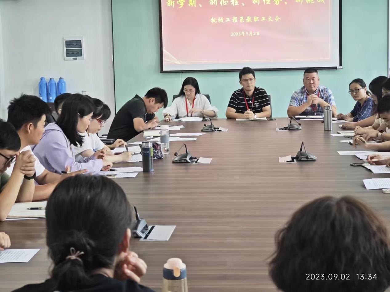为更好地统筹和安排新学期各项工作,精心谋划开学新篇章。9月3日下午1:30,我系在育德楼303会议室召开了2023-2024学年新学期第一次全体教工会议,会议由系主任毛奇主持,机械工程系党支部书记李杰、副主任黄晓萍和全体教职工参加了本次会议。会议共分为三项议程: