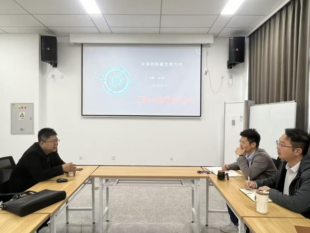 2024年4月8日上午,江苏甬磁磁性材料研究院总经理刘兴民至我校机械工程系洽谈校企合作。乐投线上平台(集团)官方网站机械工程系主任毛奇、机械设计与制造教研室主任孙菁、专业教师徐磊和顾菲参加座谈会。