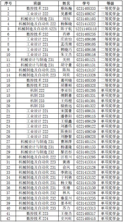 为激励在校大学生勤奋学习,努力进取,在德、智、体、美、劳等方面得到全面发展,同时也为了资助在校品学兼优的学生顺利完成学业,根据教育部、财政部及省教育厅、财政厅国家奖助学金相关管理规定和《乐投线上平台(集团)官方网站奖学金评选及管理办法》(南机电院学〔2023〕23号)要求,机械工程系认真组织评选工作,经过本人申请,班级评议,现将2023-2024学年乐投线上平台(集团)官方网站奖学金公示如下: