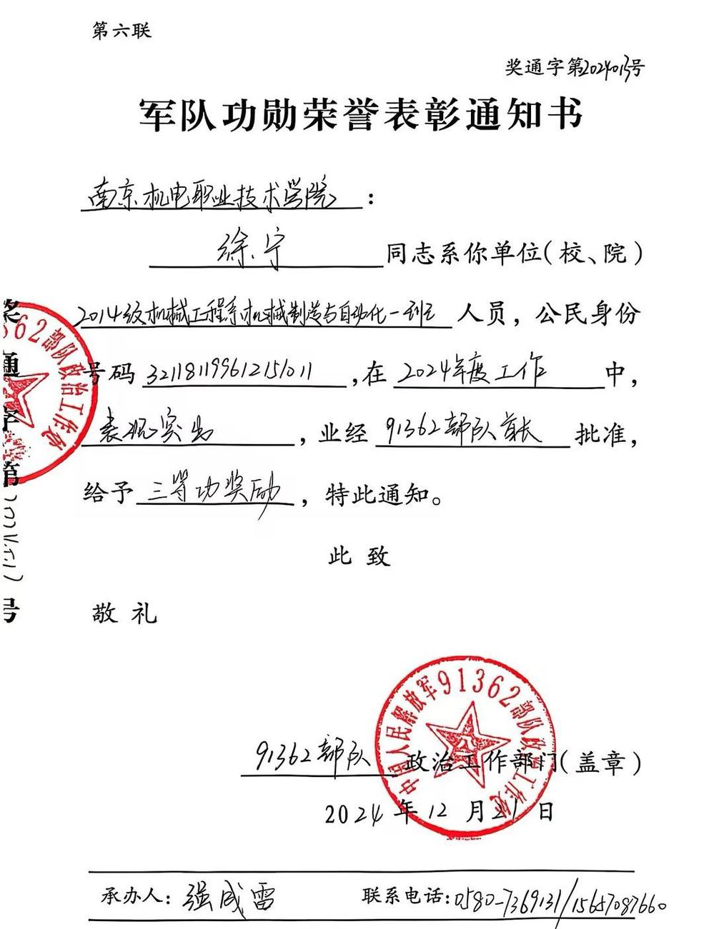 近日,我校收到中国人民解放军91362部队发来的军队功勋荣誉表彰通知书,我校2014级机械制造与自动化专业校友徐宁,因在2024年度工作中表现卓越,荣立个人“三等功”。这一荣誉不仅是对徐宁个人努力的高度肯定,也为我校增添了光彩,激励着更多学子投身国防事业。