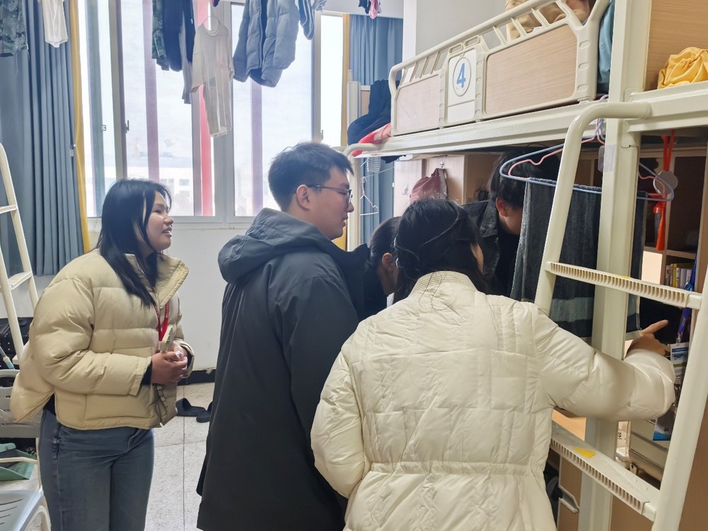 会议结束后,胡枫带领全体辅导员深入博雅苑、润泽苑和静思苑,每到一处宿舍,胡书记都与学生亲切交谈,详细询问他们的假期生活、新学期规划以及在学习和生活中遇到的困难。她鼓励学生们要做好开学前的准备,珍惜大学时光,努力学习专业知识。