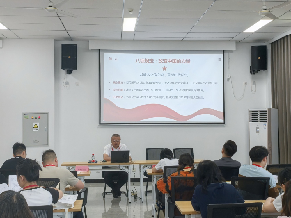 2025年6月26日,在笃行楼401会议室,校党委委员、副校长刁爱军为机械工程系党支部和电子工程系党支部全体党员讲授了一场主题为“八项规定改变中国”的专题党课。党课以“八项规定:改变中国的力量”为核心,深刻阐释了以习近平同志为核心的党中央以中央八项规定为突破口,开启全面从严治党新征程的伟大实践。刁爱军副校长结合详实数据和生动案例,系统解读了八项规定的历史脉络、现实成效与深远影响,并针对师德师风建设提出具体要求,引导全体党员增强党性修养,筑牢作风建设根基。党课内容丰富、深入浅出,为在场40余名党员教师提供了宝贵的精神滋养和实践指导。