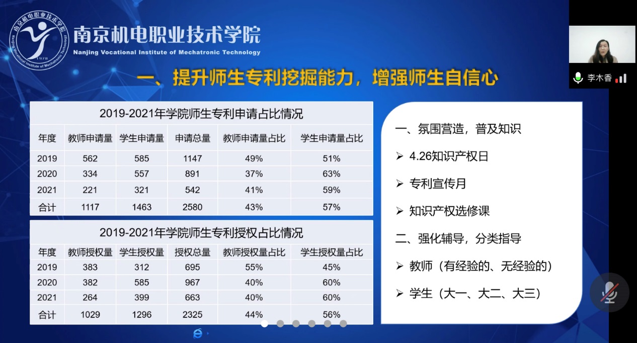 接着,李木香处长结合学院“十四五”规划提出了提升师生专利挖掘能力,增强师生自信心;加强专利申请事前评估,减少非正常申请;优化专利结构,提高发明专利占比;加强与第三方机构合作,促进专利成果转移转化;创新学院与代理机构合作模式,累积校企合作新成果等工作设想。