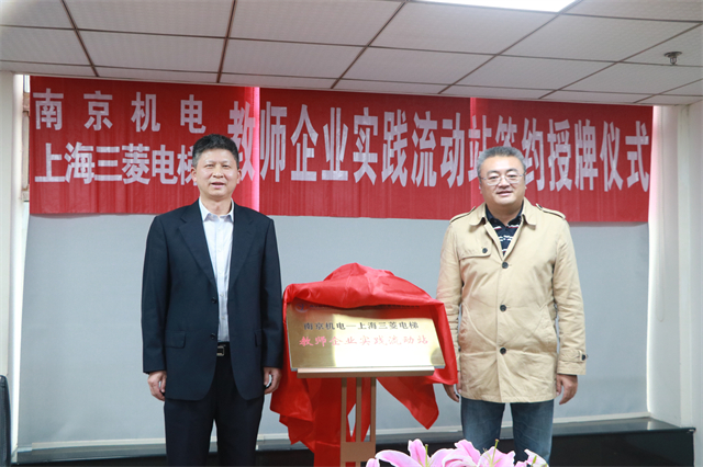 仪式上,刁爱军与王水来共同签署了“南京机电-上海三菱电梯教师企业实践流动站”校企合作协议,共同揭牌“南京机电-上海三菱电梯教师企业实践流动站”。潘理平为教师企业实践流动站的企业导师颁发了聘书。