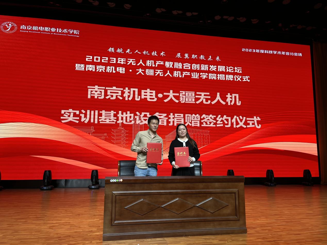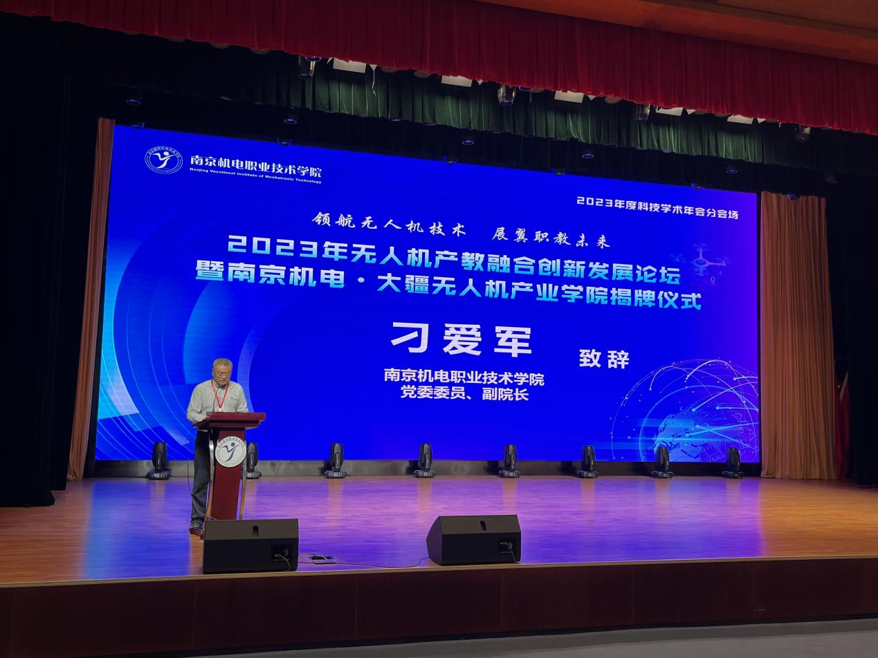 2023年10月24日下午,2023年度科技学术年会分会场——无人机产教融合创新发展论坛暨南京机电•大疆无人机产业学院揭牌仪式在学校青春剧场顺利举行。本次活动由南京市科学技术协会主办,由乐投线上平台(集团)官方网站科协、南京市高淳区科协承办,由高淳职业教育集团、南京高淳高新技术产业开发区管理办公室、南京高等职业教育创新创业园等共同协办。南京航空航天大学研究生院副院长郑祥明,南京航空航天大学飞行器设计专业工学博士、教授唐正飞,高淳区科学技术协会副主席杨腊斌,南京高等职业教育创新创业园党工委委员、副主任孙爱国,深圳市大疆创新科技有限公司华东区代表滕菲,南京弘谷信息科技有限公司总经理赵华君,南京弘谷信息科技有限公司副总经理顾启凌,学校党委委员、副校长刁爱军,党委委员、纪委书记、工会主席姜振宇等领导出席本次活动。本次活动由学校科研及校企合作处处长李木香主持,电子工程系全体教师及学生代表,高淳职业教育集团理事单位江苏省高淳中等专业学校和高淳第一中学的师生代表参加了本次活动。