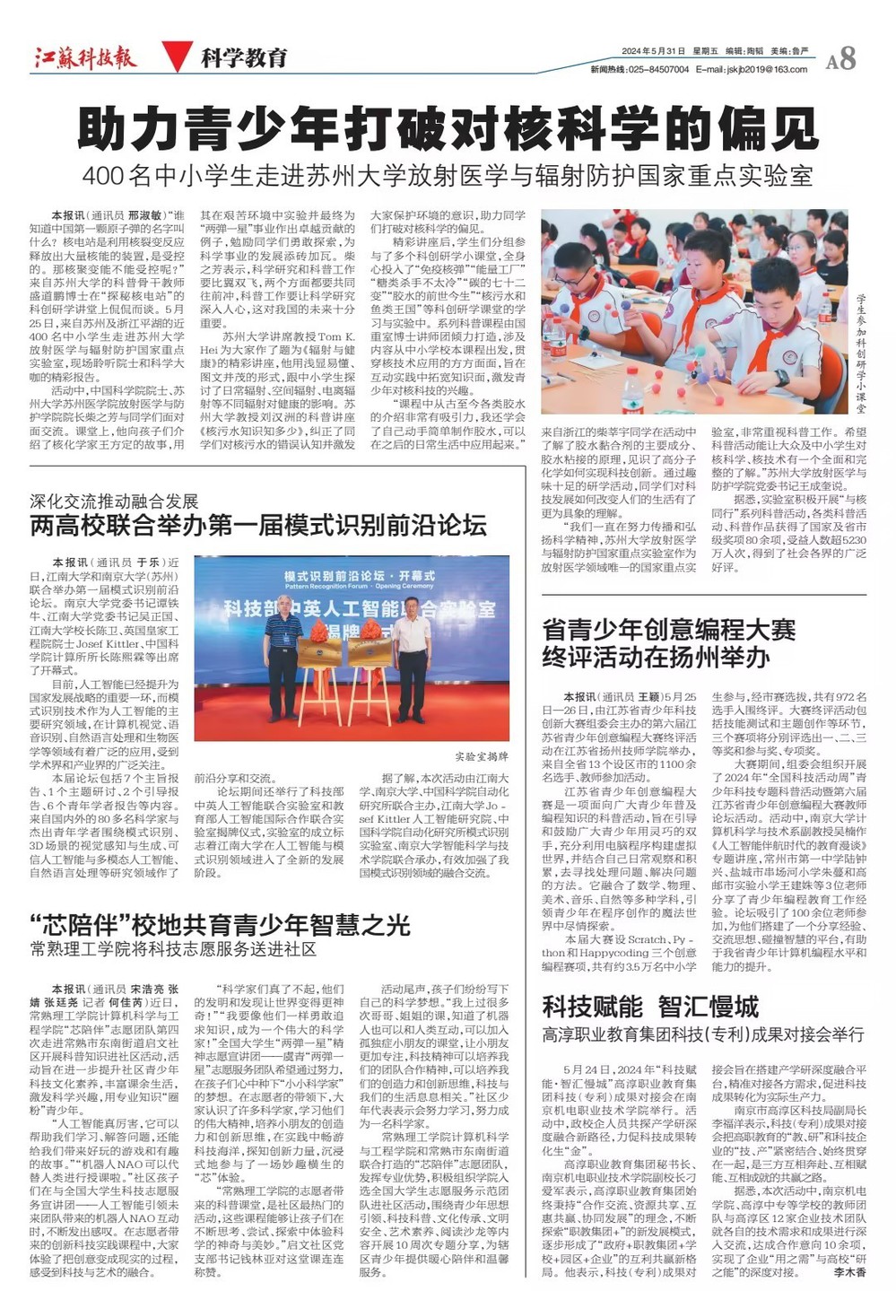 近日,江苏科技报报道我校承办的2024年“科技赋能·智汇慢城”高淳职业教育集团科技(专利)成果对接会,全文如下: