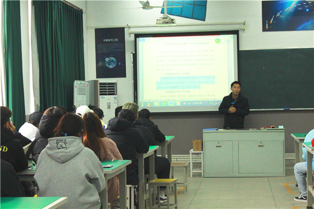 随后,蓝岛创客空间创客导师杨阳向同学们具体介绍了第四期双创实验班的人才培养方案及规章制度,并再次强调了时间管理的重要性。他说,希望各位双创实验班的同学遵守第四期双创实验班的班规,充分利用在学校的时间,主动自觉地制作创客项目,培养团队精神,积极参加创新创业比赛,为未来的发展打好基础。最后,第四期“双创实验班”按照第四期“双创教育试点班”人才培养方案分成了(1)班和(2)班,由创客导师杨阳老师担任(1)班班主任,由创客导师候俊老师担任(2)班班主任。