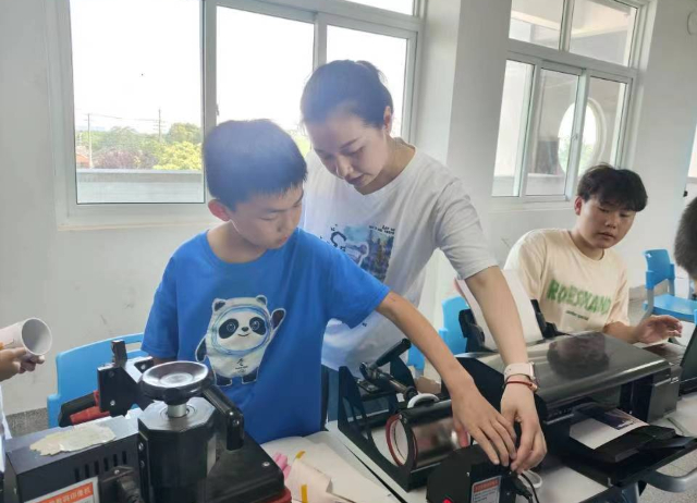候老师和朱老师开展了“航天创意制作——陶艺”和“航天创意制作——热转印”活动。“航天创意制作——陶艺”是对“航天创意激荡”活动产生的创意进行动手制作,学生们在候老师的鼓励下,逐步放下对陶艺制作的谨小慎微,大胆创造,完成了一件件具有创意的陶艺作品。“航天创意制作——热转印”活动中,学生们积极挑选航天主题的照片,在朱老师的指导下利用热转印机将图案绘制在马克杯和鼠标垫上。看着一个个独具个性、承载美好的马克杯和鼠标垫,学生们爱不释手。