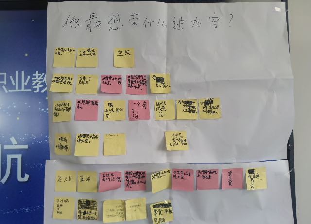接着,黄老师带着学生们进行了“航天创意激荡”活动。学生们以把各种创意载荷带入太空为主题,开展头脑风暴,把自己的奇思妙想展示在白纸上,描述了自己对未来空间站、太空城市、月球科研站、航天员食品、航天员训练器材、航天员娱乐设施、航天服、空间站用品的想象。