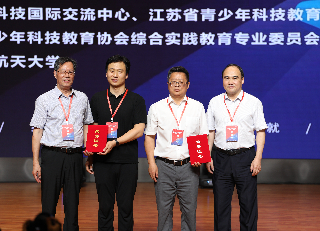 接着,为感谢乐投线上平台(集团)官方网站多年来为航天人才建设付出的努力,为中小学校提供的航天创新学习平台和为大赛作出的努力和贡献,特由中国航天科技国际交流中心、江苏省青少年科技教育协会、江苏省航空航天学会为乐投线上平台(集团)官方网站颁发优秀组织奖;为周庆礼院长颁发特别贡献奖。