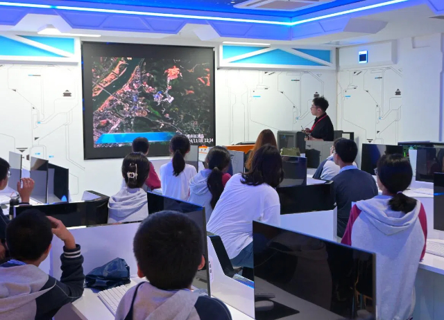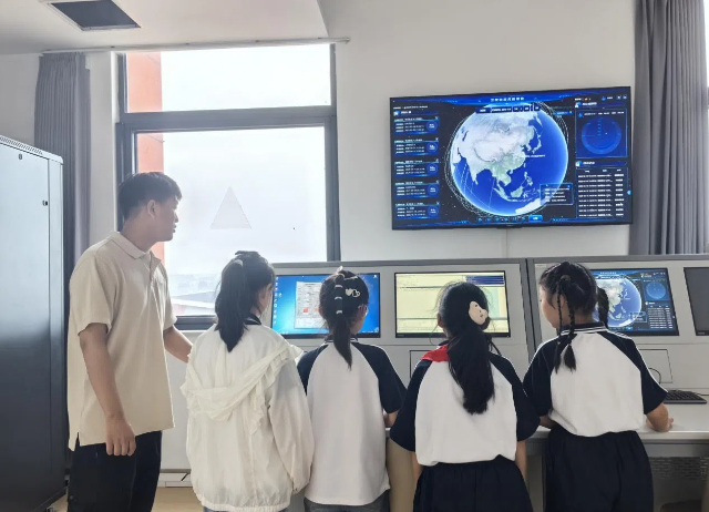 航天专业科普场馆建有全国职业院校首个“天地一体”航天科普阵地,包括航天科普馆、卫星地面接收站实验室、卫星测控中心,配套“航空航天装备智能制造技术”省级示范性虚拟仿真实训基地,创新“数字孪生+实景操作”虚实融合的科普阵地。学校卫星通信与导航技术专业负责人黄威老师,带领50余名中小学生实景操作卫星地面接收站并互动体验了卫星测控中心,孩子们无不惊叹于我国先进的航天科技。